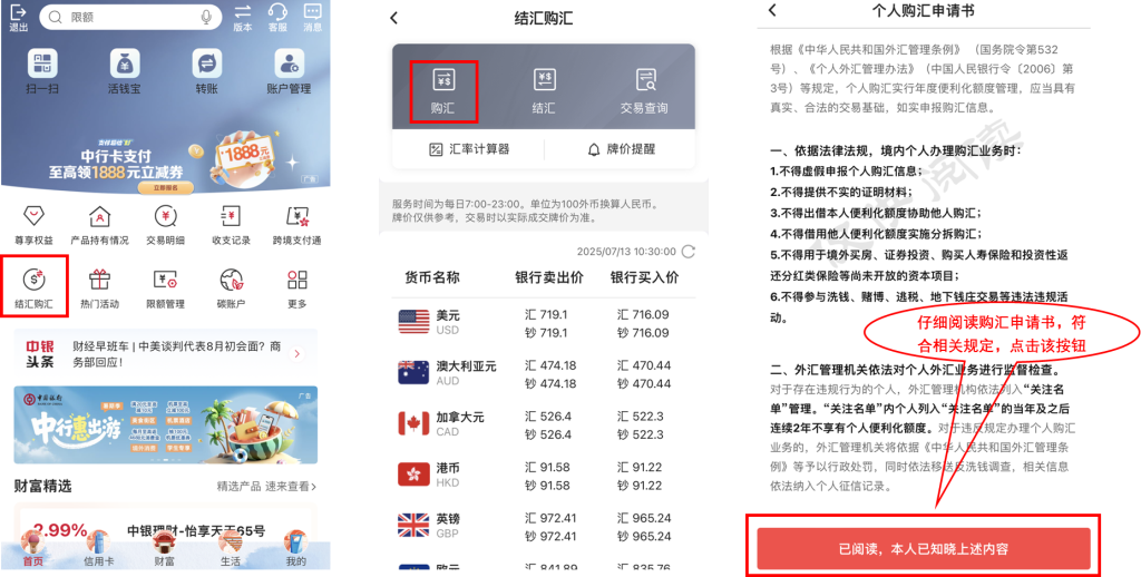 - 打开中国银行 APP,依次进入「结汇购汇」板块,选择「购汇」功能。仔细阅读购汇申请书,确认符合规定后,点击 “已阅读,本人已知晓上述内容”。