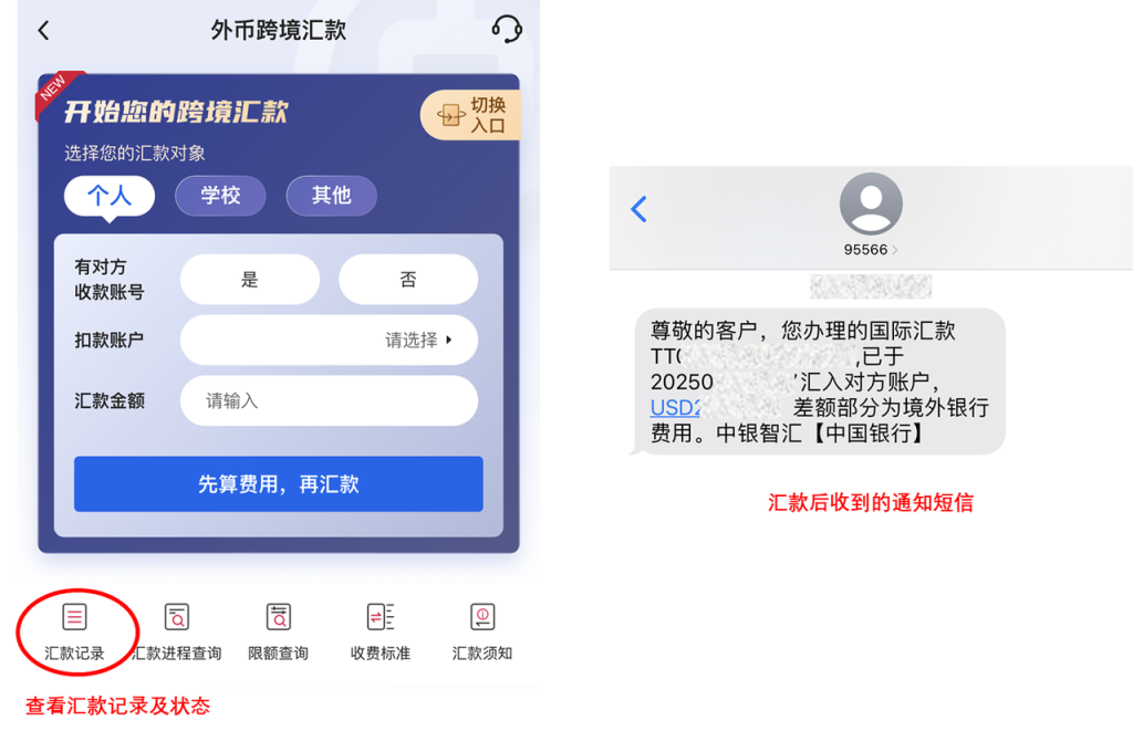 - 查看汇款状态:提交申请后,可通过中国银行 APP「汇款记录」功能实时追踪进度。汇款成功后,银行将发送短信通知,请注意查收。
