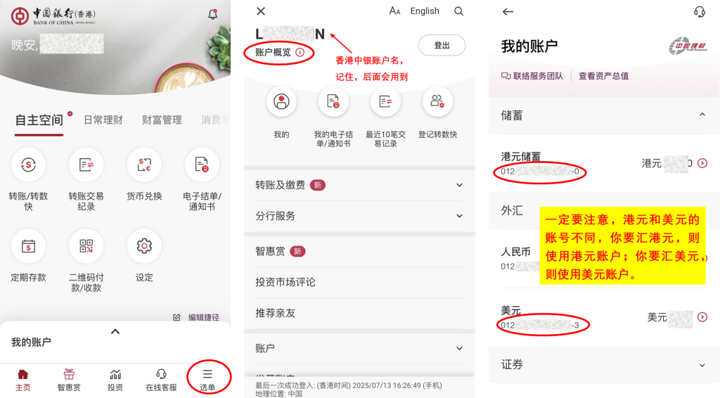 打开香港中银 APP,通过「选单」,获取账户名;点击「账户概览」,查询账户号码。