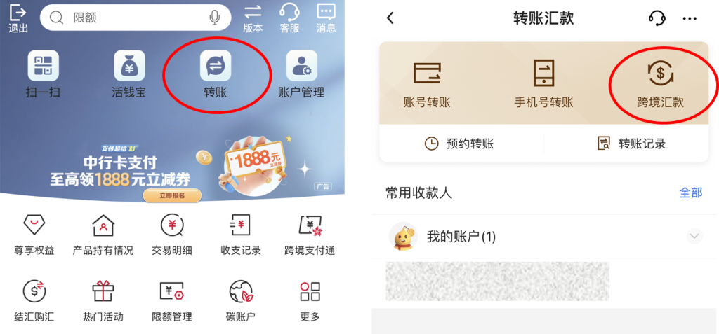 - 打开中国银行 APP,从首页进入「转账」功能,选择「跨境汇款」。