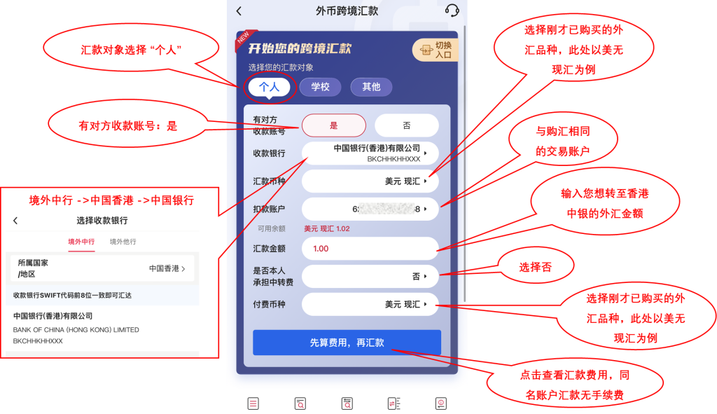 购汇完成后,即可通过跨境汇款将外汇转至香港中银账户,具体步骤如下: