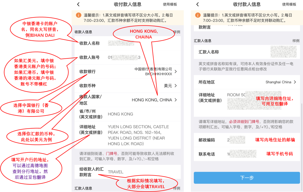 - 完整填写收付款人信息(确保与香港中银账户信息一致)。